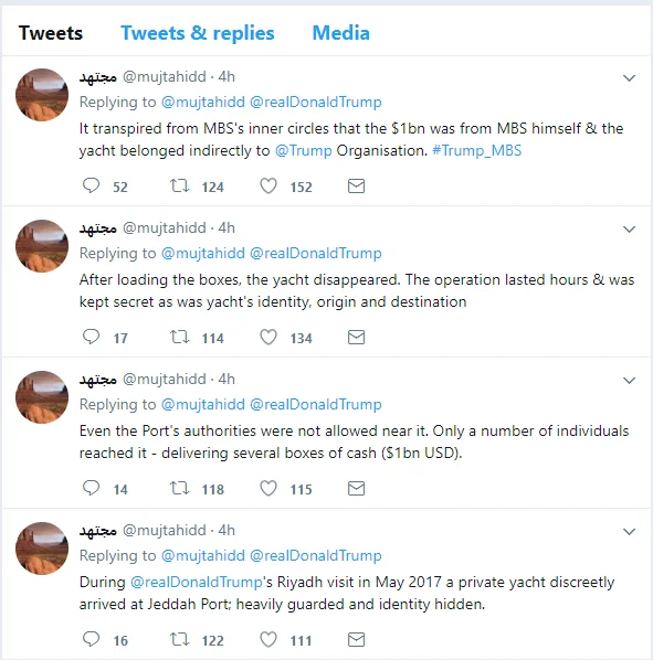 During Trump’s visit to Saudi in May, a mysterious boat linked to the Trump organisation arrived at the port of Jeddah, and it was filled with $1bn in cash, a personal gift from bin Salman, Mujtahidd claimed without clarifying his sources.