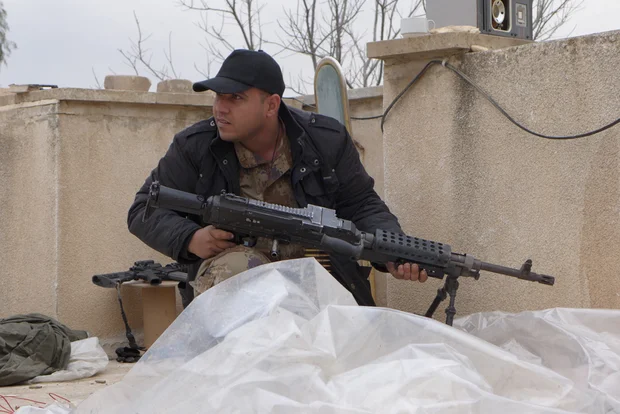 Golden Division 2nd lieutenant Amar prepares to fire at IS positions (MEE/Tom Westcott)