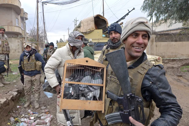 Iraqi army troops arrive with 'lucky pigeons', and immediately come under fire (MEE/Tom Westcott)