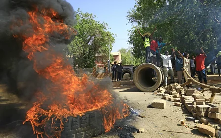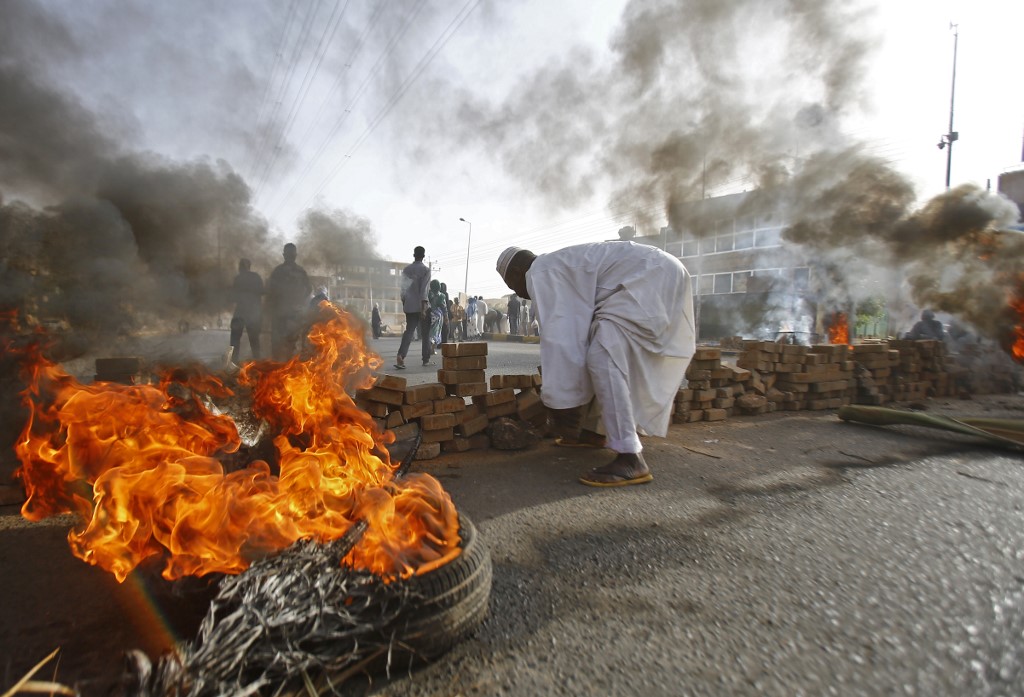 In Khartoum's twin city of Omdurman, across the Nile, thousands of people took to the streets, blocking roads with stones and burning tyres, a Reuters witness said.