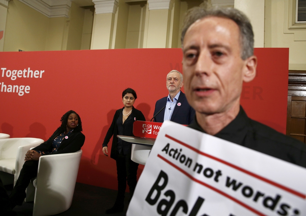 Demonstrators led by human rights activist Peter Tatchell disrupted a speech by the British Labour Party leader Jeremy Corbyn on Saturday, calling for a more forthright stand against the bombing of east Aleppo