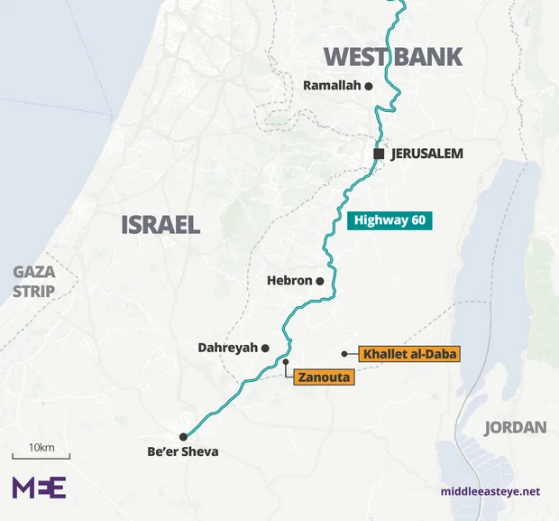Zanouta is situated on a hill overlooking Highway 60, a settler road which gives Israeli citizens access from the West Bank all the way to Beersheba, the main Israeli city in the Negev Desert.