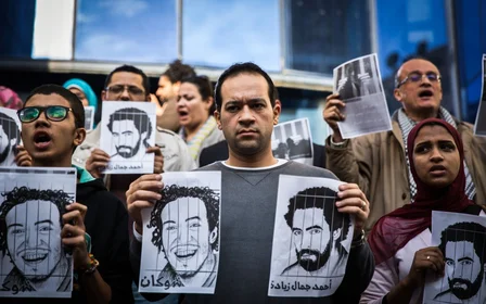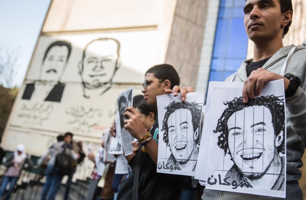 File photo shows protest in support of Egyptian photojournalist Mahmoud Shokan