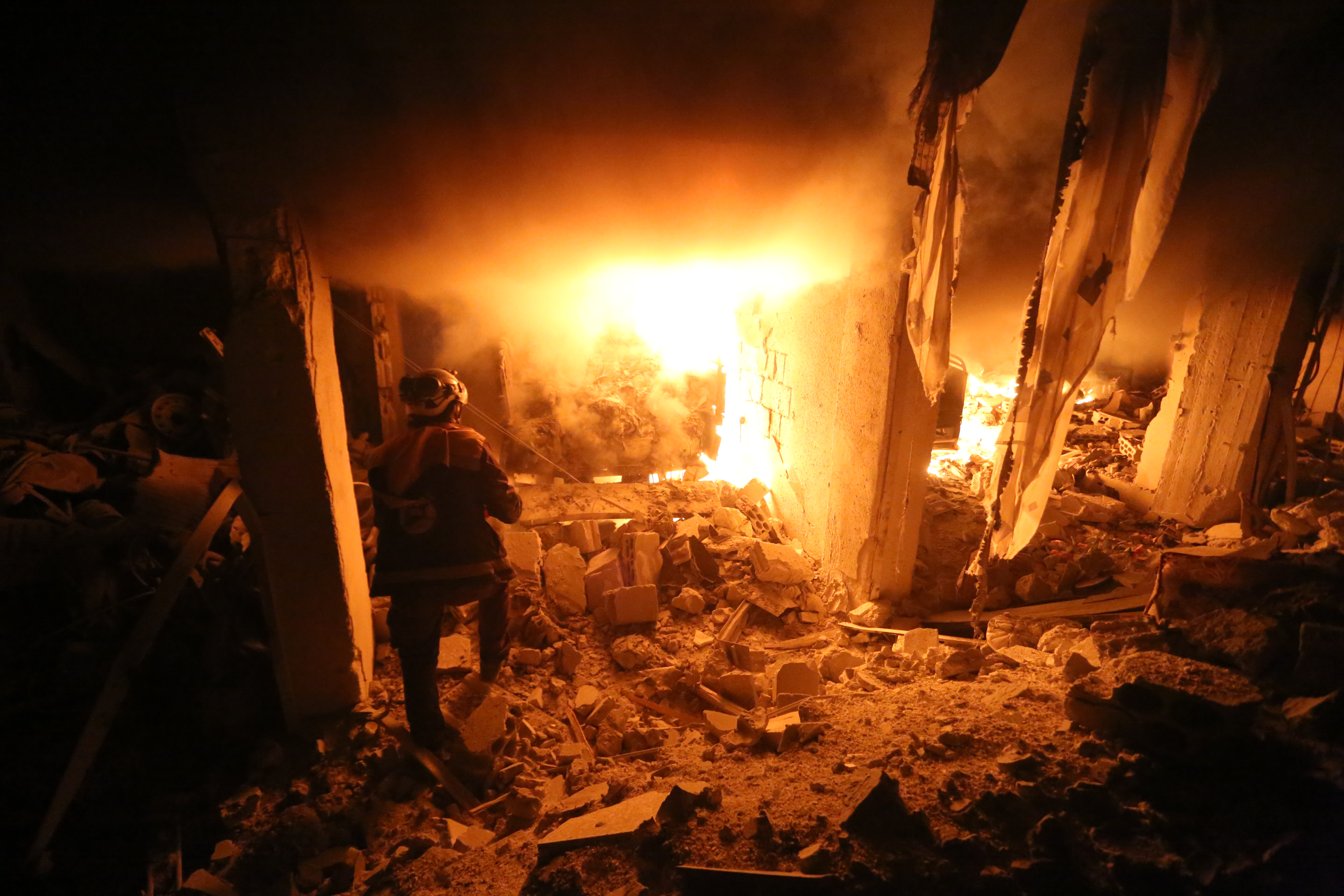 Civil defence workers desperately try to quell flames caused by a suspected Russian air strike (MEE/Ali Haj Suleiman)