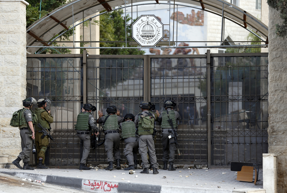 Israeli forces retaliated by firing rubber bullets, tear gas and stun grenades before forcing open the gates of the university and going inside.