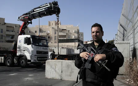 Israeli security forces stand guard as Palestinian Muslim worshippers take part in Friday noon prayers in the east Jerusalem neighbourhood of Ras al-Amud on 9 October 2015 (AFP)