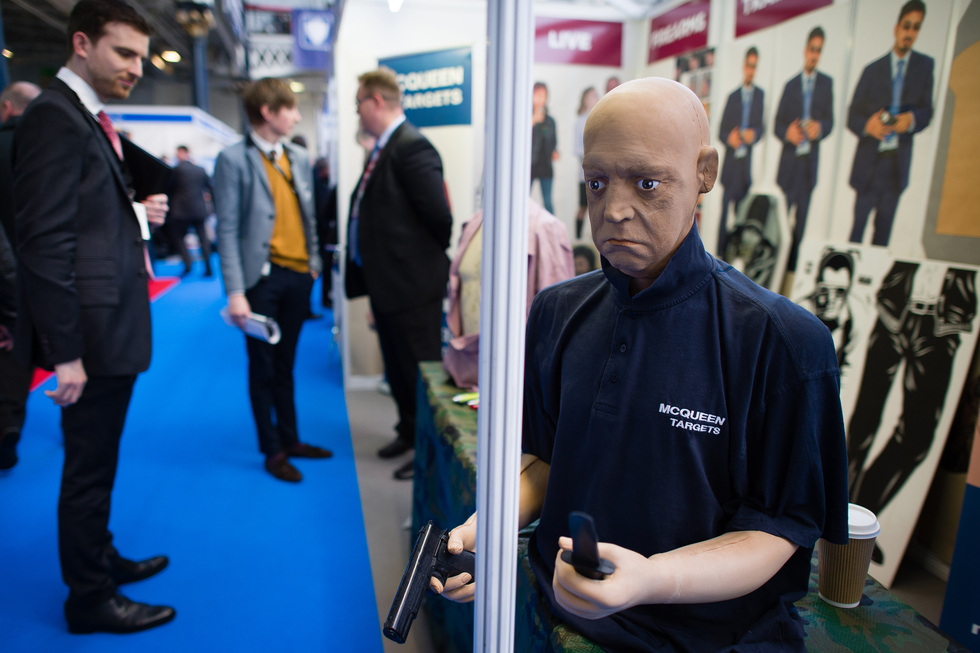 Held at the Olympia venue in west London, the conference is a typical boys-with-toys event (and, yes, it is overwhelmingly men). Dodging roaming mini-robots and blokes in spiffy suits, several men in army fatigues prowl between the stalls. A lone individual wanders the venue in a hazmat suit, passing steel-eyed mannequins holding knives and guns.