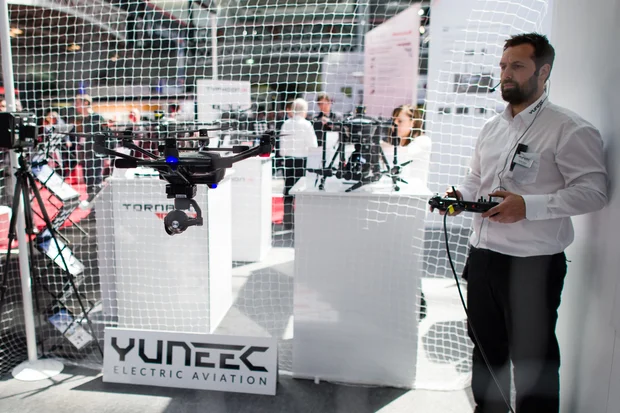 Overhead, a flock of remote-controlled drones buzz in formation.