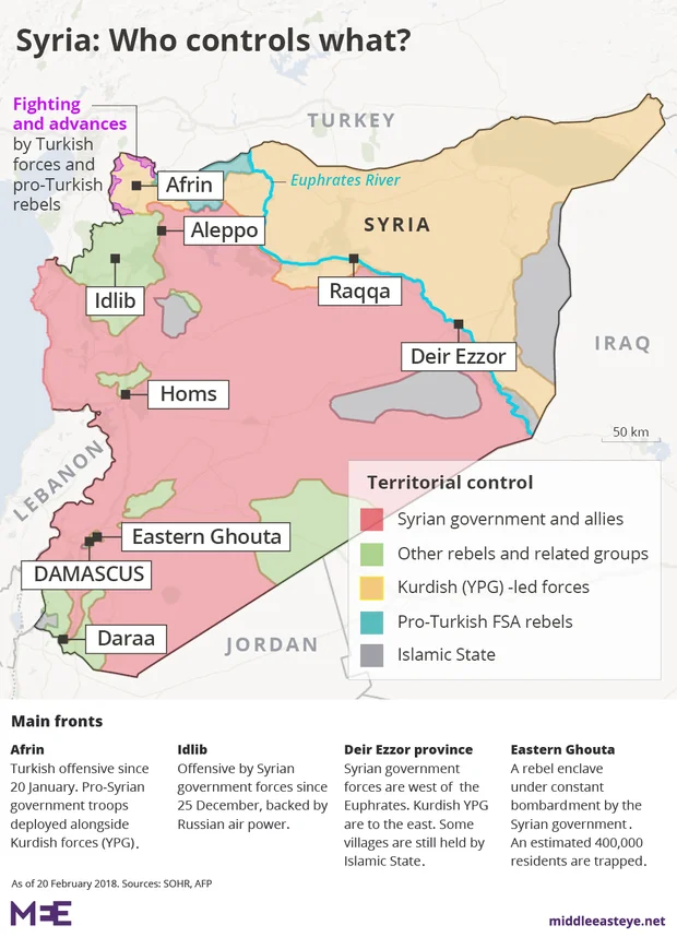 Fighting has escalated on several fronts in Syria this year. As Assad has pressed the offensive against eastern Ghouta, Turkey has launched an incursion against Kurdish fighters in the northwestern Afrin region.