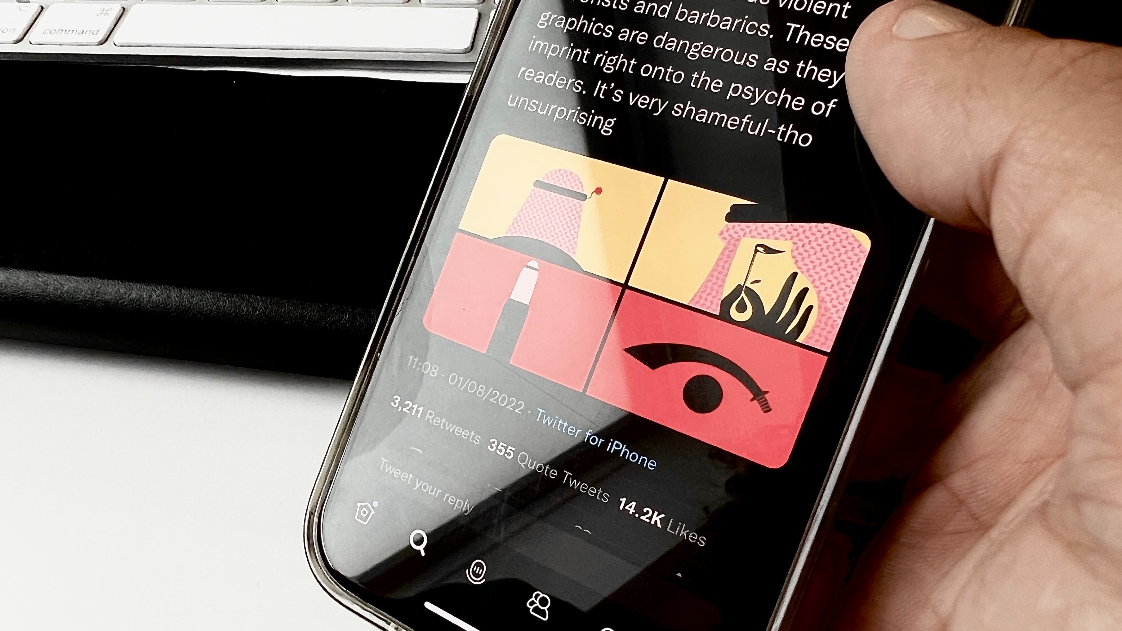 The minimalistic two-dimensional illustrations incorporated throughout the article take recognisably Saudi and Arab iconography and morph this into more sinister images with undertones of violence.
