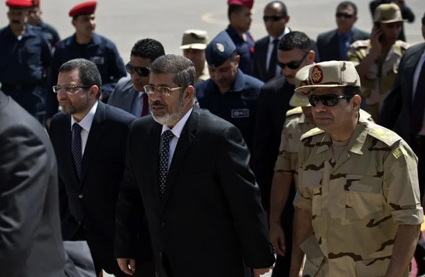 Morsi (C), with Sisi (R), his then-defence minister, in May 2013 (AFP)