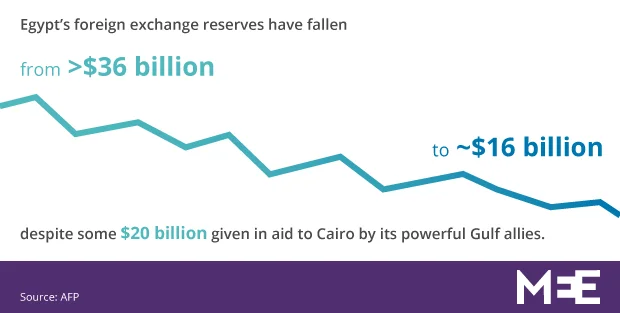 Egypt's foreign exchange reserves have fallen from more than $36bn in 2010 to about $16bn, despite some $20bn given in aid to Cairo by its powerful Gulf allies. Reserves have been rising for five months in a row but continue to be less than half their December 2010 level, Bloomberg reported.