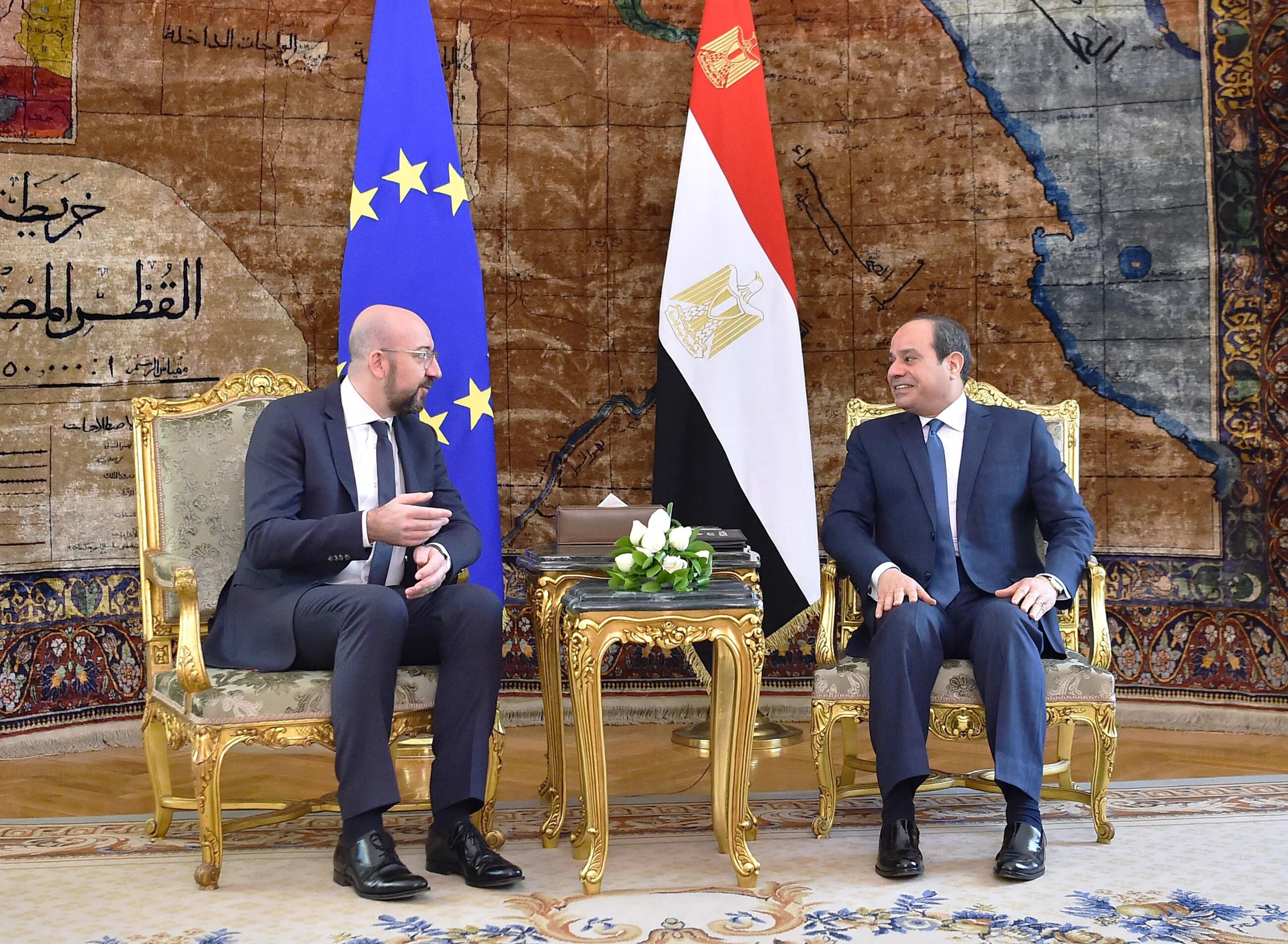 Egyptian President Abdel Fattah el-Sisi (R) meeting with President of the European Council Charles Michel at the presidential palace in Cairo, on 12 January 2020 (AFP)