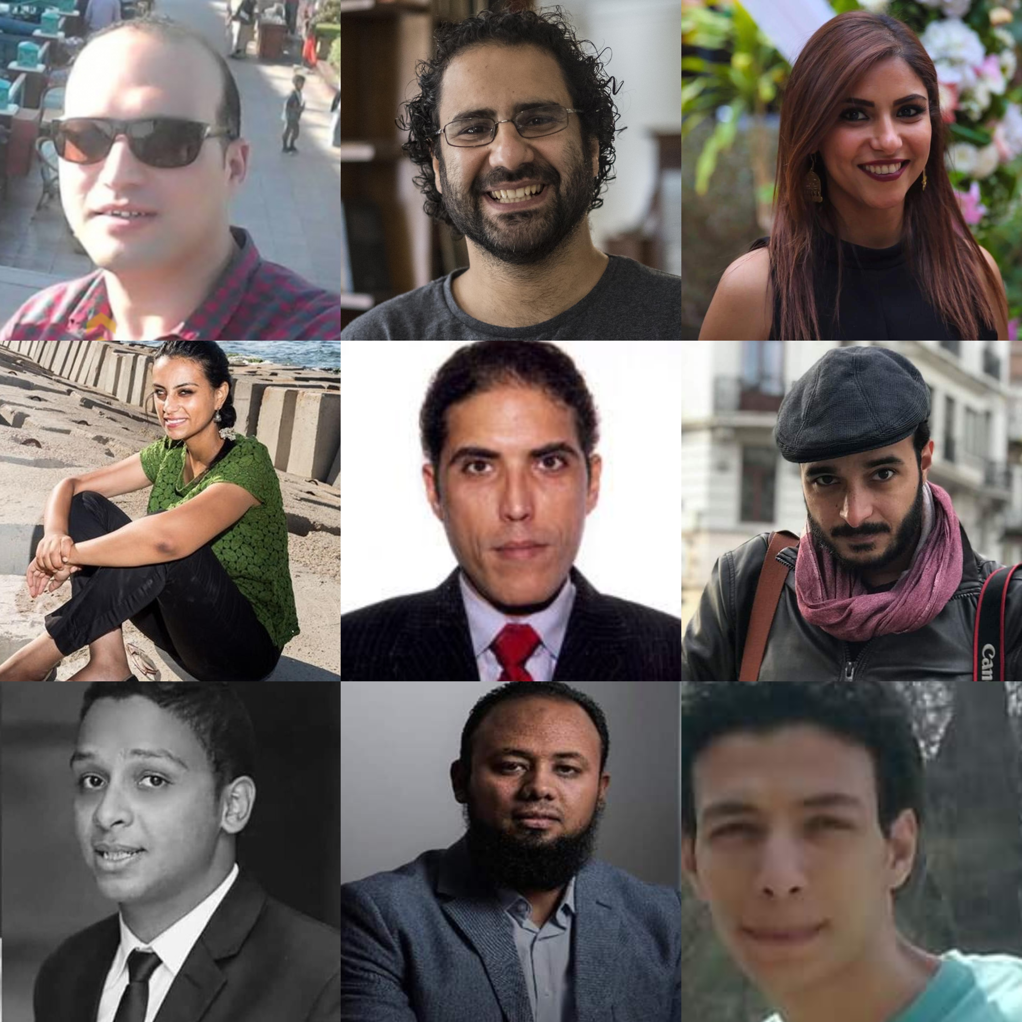 From L-R: Solafa Magdy, Alaa Abdel Fattah, El-Sayed Abdellah, Mahienour El-Masry, Khaled Dawoud, Hossam el-Sayyad, Mostafa Gamal, Mohamed el-Baqer, Mohamed Oxygen (Twitter)