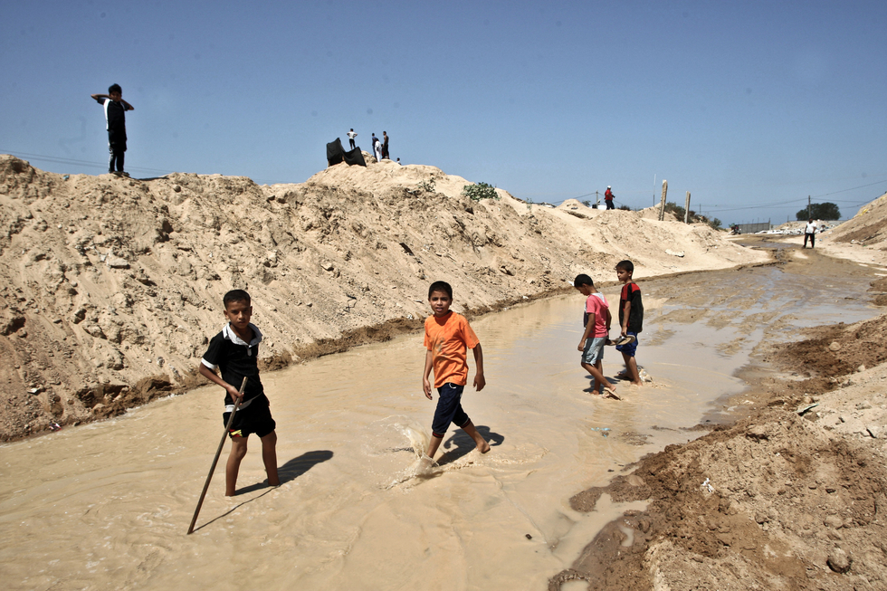 Palestinian children walk among water flowing into Gaza from Egypt (MEE/Mohamed Asad)