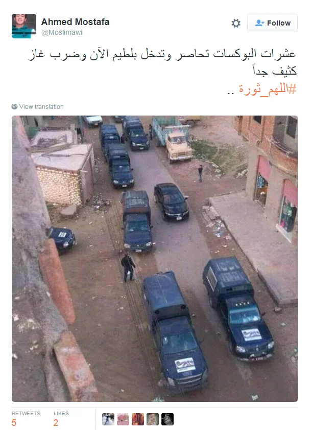Translation: Tens of pick-up trucks are surrounding and entering Baltim now and firing large amounts of tear gas