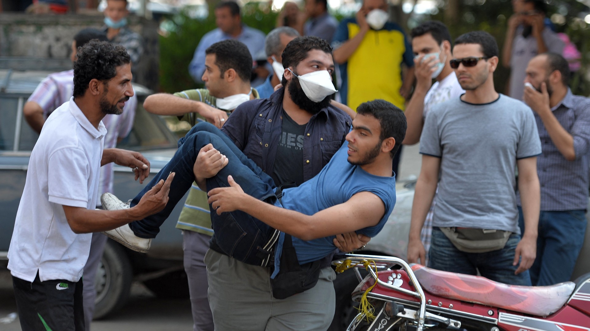 An Egyptian man carries a protestor injured by security forces near Cairo's Rabaa al-Adawiya square on 14 August 2013 (AFP)