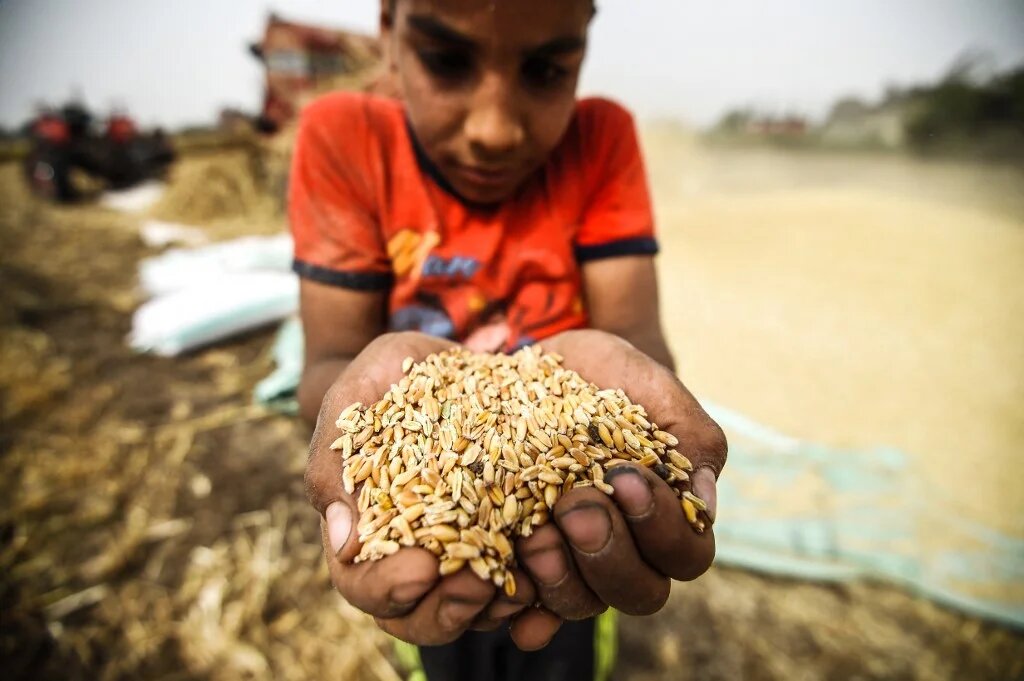 An Egyptian boy shows a handful of harvested wheat in Saqiyat al-Manqadi, northern Nile Delta province of Menoufia, 1 May 2019 (AFP/file photo)