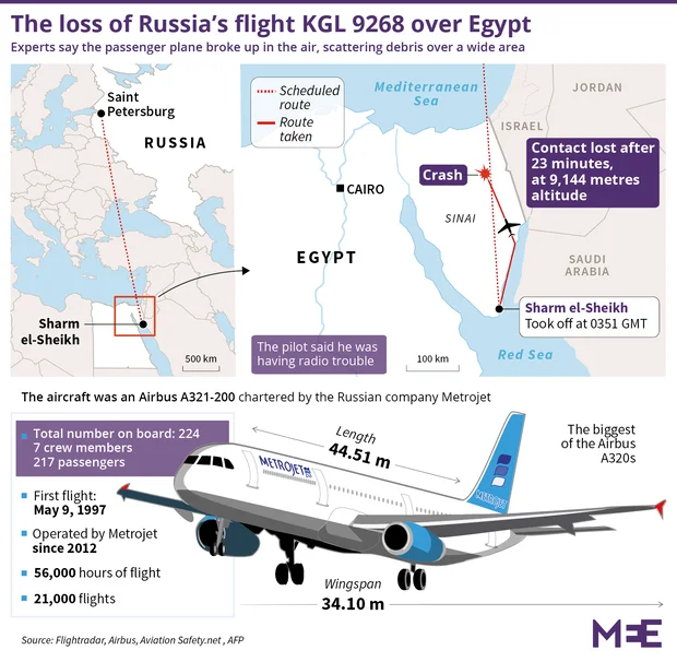 GAZA CITY - All pre-flight checks on a Russian passenger plane that broke up in mid-air over Egypt’s Sinai Peninsula on Saturday were carried out as normal, an Egyptian airport security official and the chairman of the state company that runs civilian airports has told Middle East Eye.