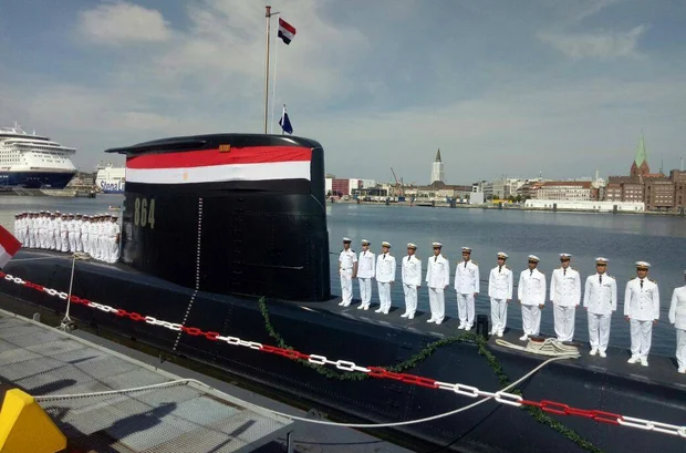 Egyptian Navy officers stand aboard the deck of S42, a German-made submarine, during a handover ceremony in the German city of Kiel in August 2017 (AFP)