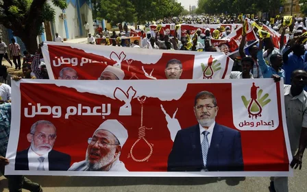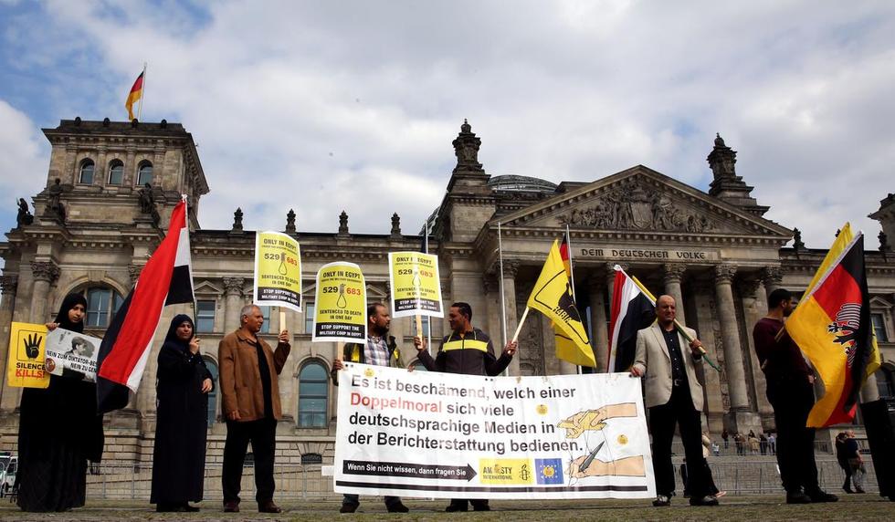 Egyptian demonstrators hold banners as they gather on 22 May 2015 in front of Bundestag to protest against Egyptian President Abdel Fattah al-Sisi's visit to Germany (AA)