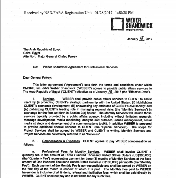 The firms will also showcase key attributes of Egypt’s civil society in exchange for a fee of $1.8m a year.