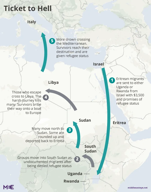 Kiflom was one of the few who survived, and eventually made it to Italy. But his journey began when he left Israel in April 2016 under its so-called "voluntary departure" programme, which moves unwanted African migrants to a third country with promises of financial support and official refugee status at their destination.