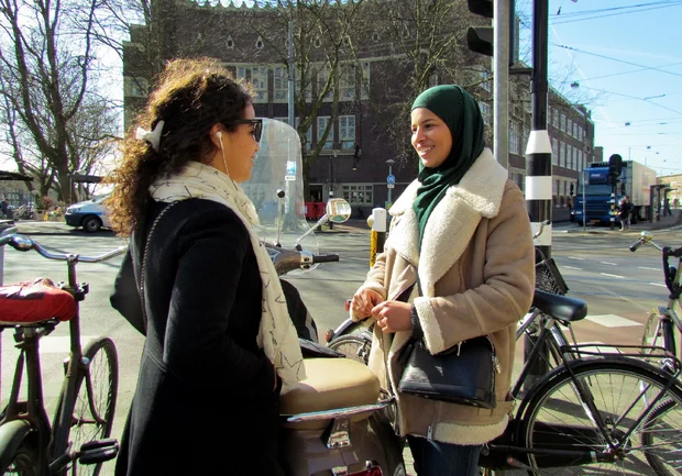 Shaima talks to a friend outside a cafe in De Baarsjes (MEE / Venetia Rainey)