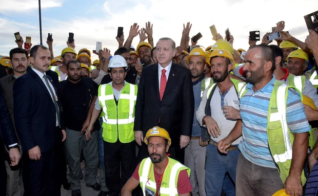 President Erdogan (C) poses for a photograph with Turkish construction workers (AFP)