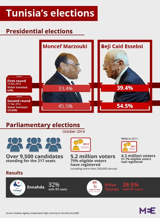 Victory for Essebi would allow him to solidify power, with his new party, Nidaa Tounes, already controlling most seats in parliament after defeating the main rival Ennadha party in legislative elections in October. Nidaa Tounnes has tried to present itself as the secular party and accuses Ennadha - seen as Tunisia's version of the Muslim Brotherhood - of being Islamist.