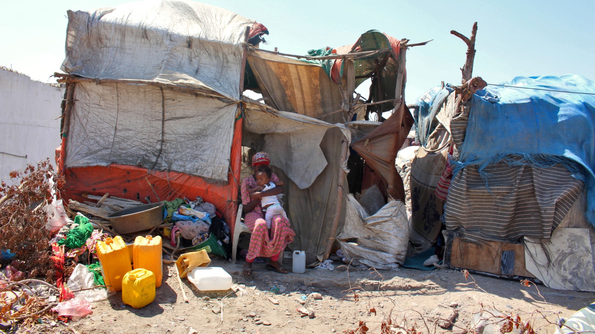 Ethiopians at a camp for African refugees in the Khur Maksar district of Aden, Yemen, on 3 March 2022 (AFP)