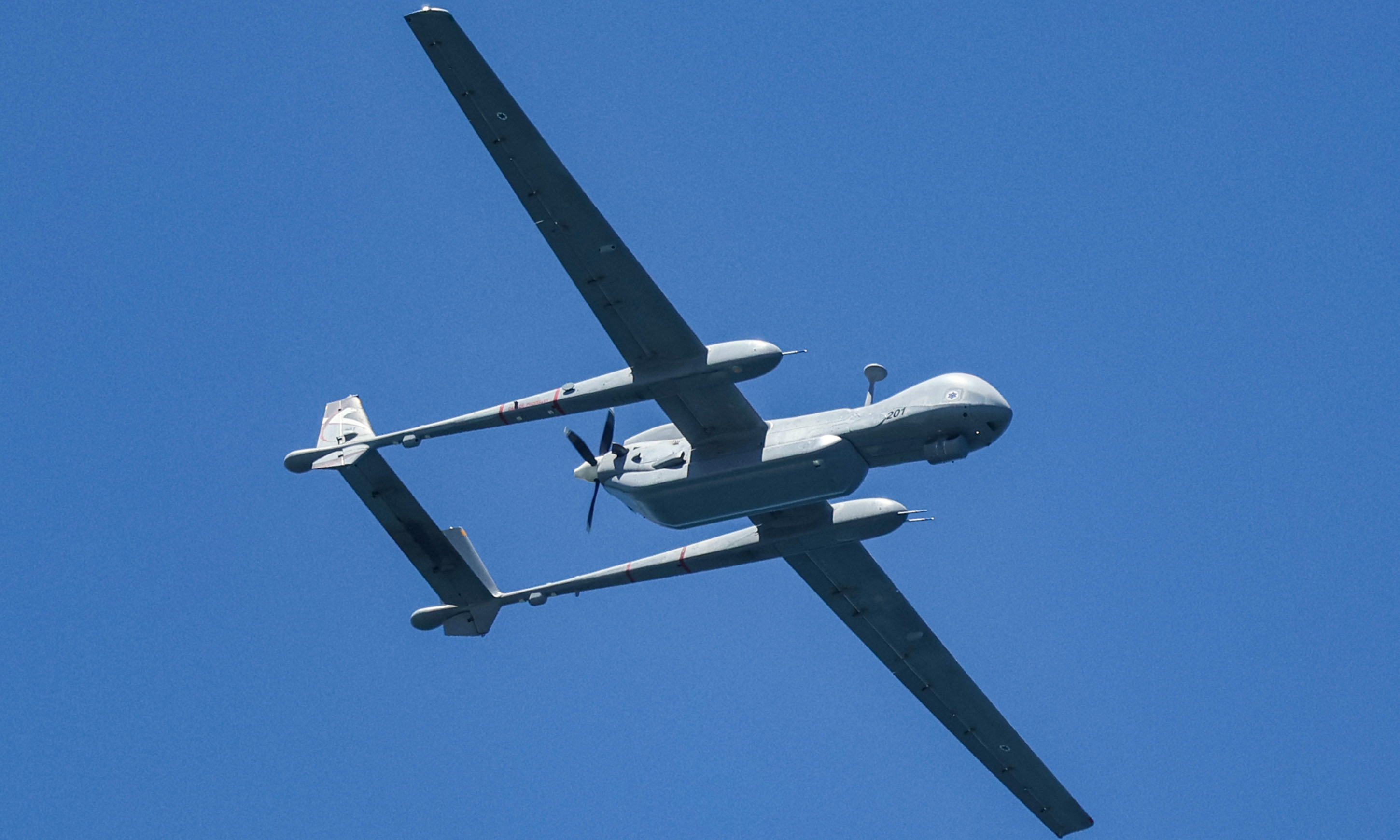 An Israeli Air Force IAI Eitan unmanned reconnaissance aircraft at an air show in Tel Aviv on 26 April 2023 (Jack Guez/AFP)