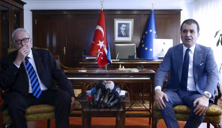 Turkish European Union Affairs Minister and Chief Negotiator Omer Celik (R) welcomes the President of the Council of Europe (AFP)