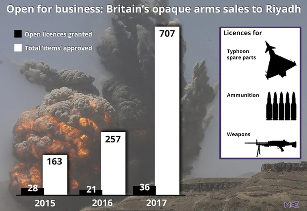 But figures seen exclusively by Middle East Eye show that the government has actively overseen a more than 75 per cent increase in the use of secretive "open licences" to approve additional arms sales to the kingdom, including vital parts for the jets striking targets in Yemen.