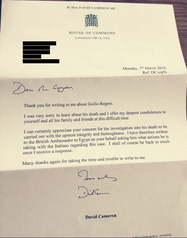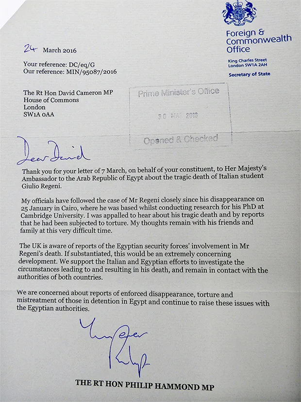 Two weeks earlier in his letter to the prime minister whom he addresses as “David,” Hammond writes, “My officials have followed the case of Mr Regeni closely since his disappearance.