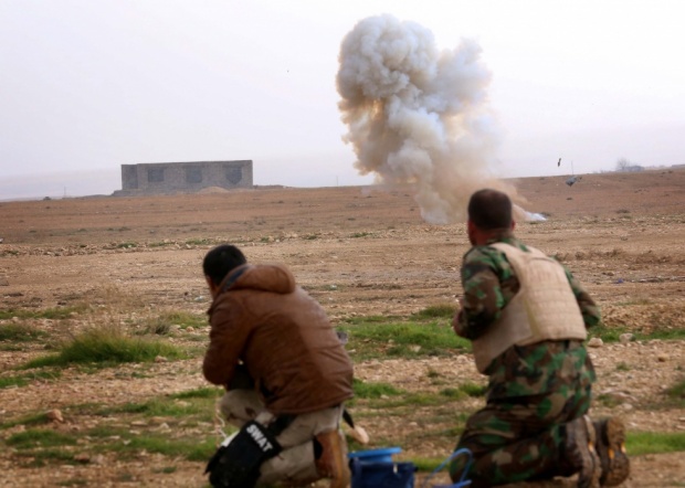 Kurdish fighters detonate a landmine on the outskirts of Sinjar on 15 January (AFP)