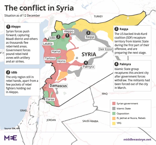 The Syrian government is being supported by Russian air strikes and Iran-supported militias drawn from across the region.