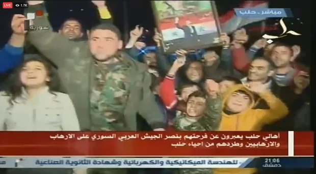Syrian state television on Monday night broadcast what it said was footage of Syrians celebrating in the streets of Aleppo after the announcement, chanting "By our souls, by our blood, at your service Bashar [al-Assad]."