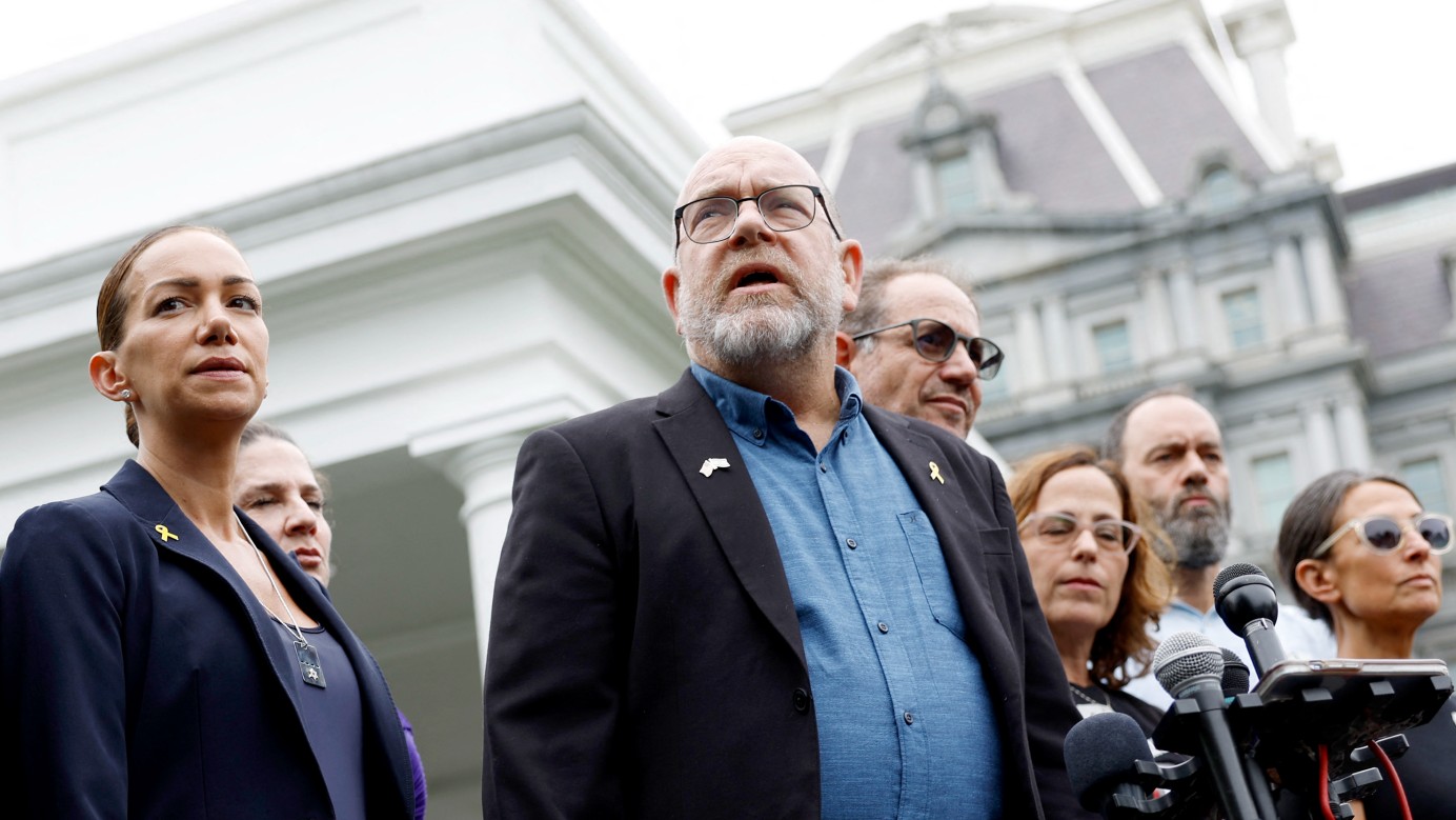 Jonathan Dekel-Chen, (second from left) the father of hostage in Gaza, Sagui Dekel-Chen, speaks to reporters near White House, on 25 July 2024 in Washington DC (Anna Moneymaker/AFP)