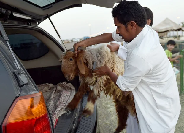 A customer takes home his sheep for Eid from the market in Riyadh (AFP)