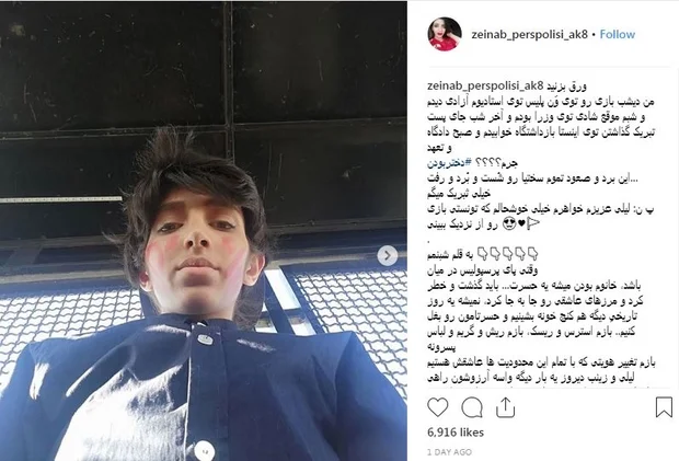 Zeinab, who goes by the name Zeinab_perspolisi_ak8 on Instagram, was detained after she tried to attend a football match disguised as a man last September.