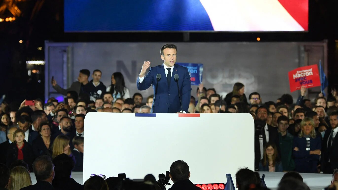 French President and La Republique en Marche (LREM) party candidate for re-election Emmanuel Macron celebrates after his victory in France's presidential election, at the Champ de Mars in Paris, on 24 April, 2022. (AFP)