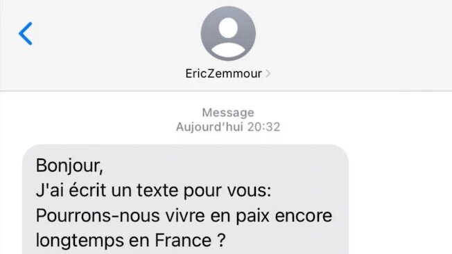 On Friday 8 April, just before Shabbat, people reported receiving a message from "EricZemmour" which read, “Will we be able to live in peace for much longer in France?”