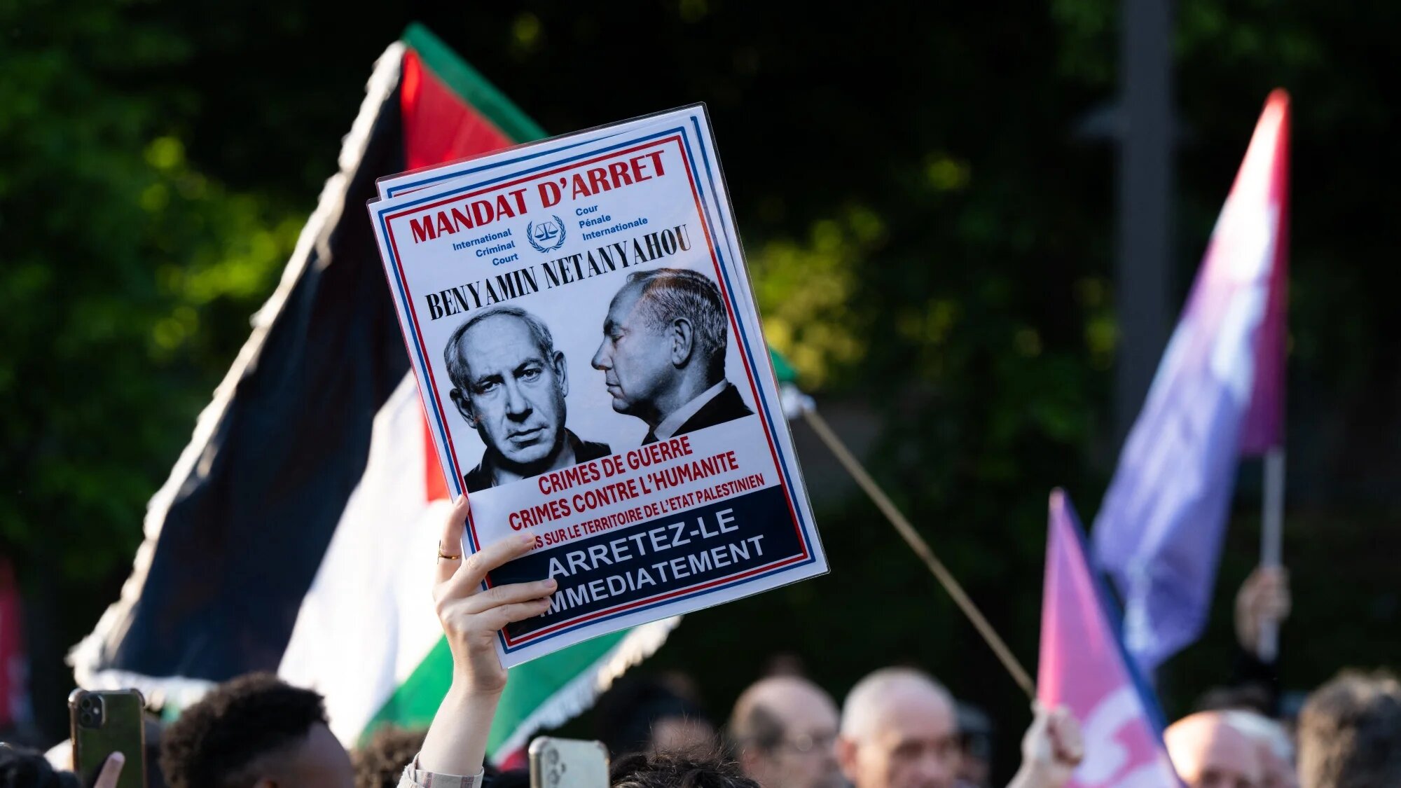 A protester holds a fake arrest warrant for Israeli Prime Minister Benjamin Netanyahu during a demonstration in Paris on 6 May (AFP/Leo Vignal)