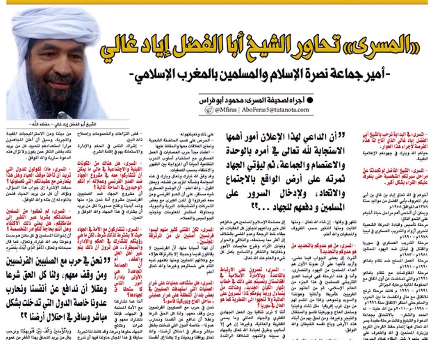In an interview published in the latest issue of al-Qaeda in Yemen’s weekly al-Massar on 3 April, Iyad Ag Ghali, the public face of Islamic armed groups in the Sahara and the Sahel, spoke about the strategy of the new movement of which he became the leader in February.