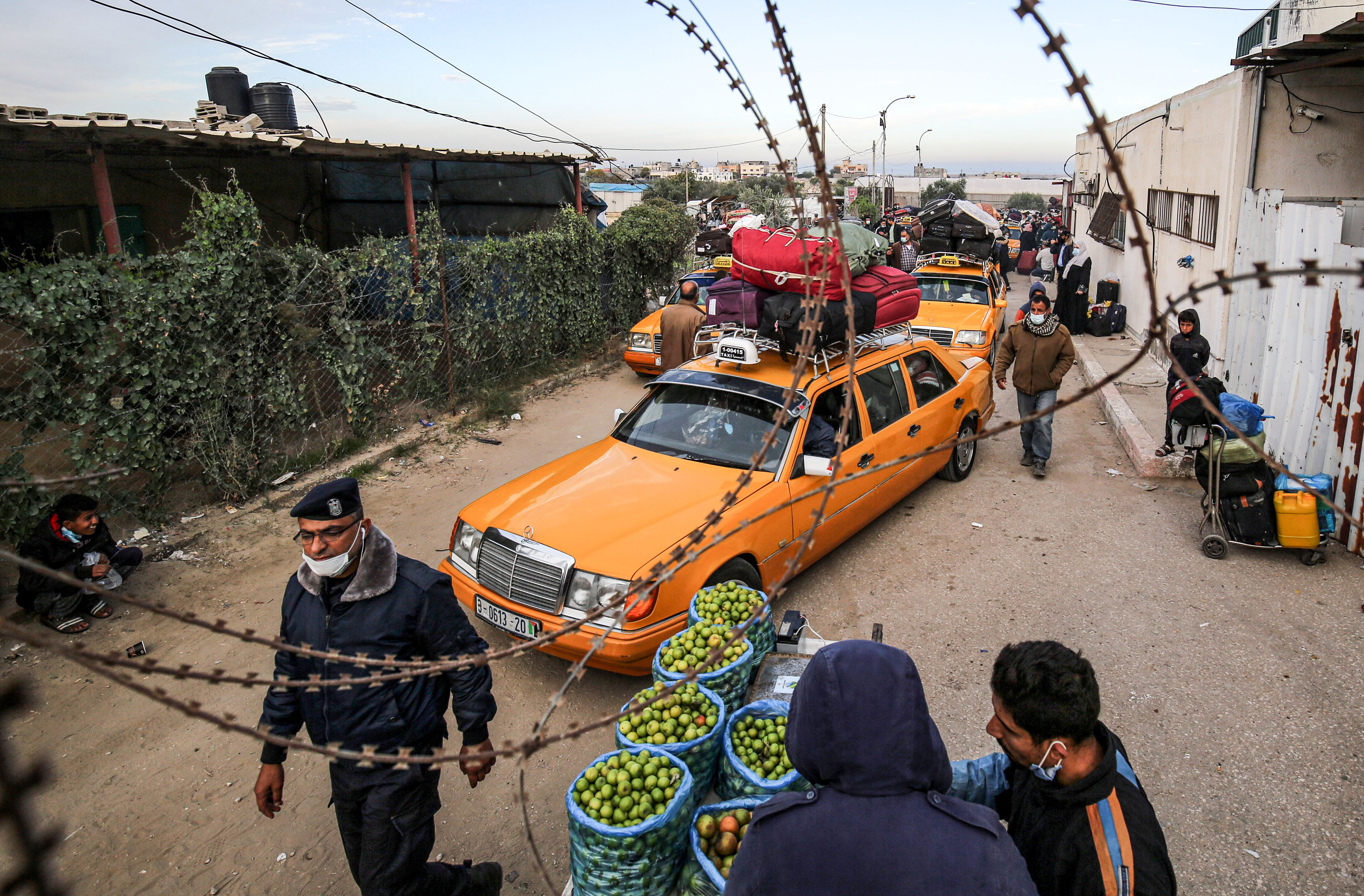 Vehicles transporting Palestinians about to cross onto the Egyptian side wait at the Rafah border crossing between the Gaza Strip and Egypt (AFP)
