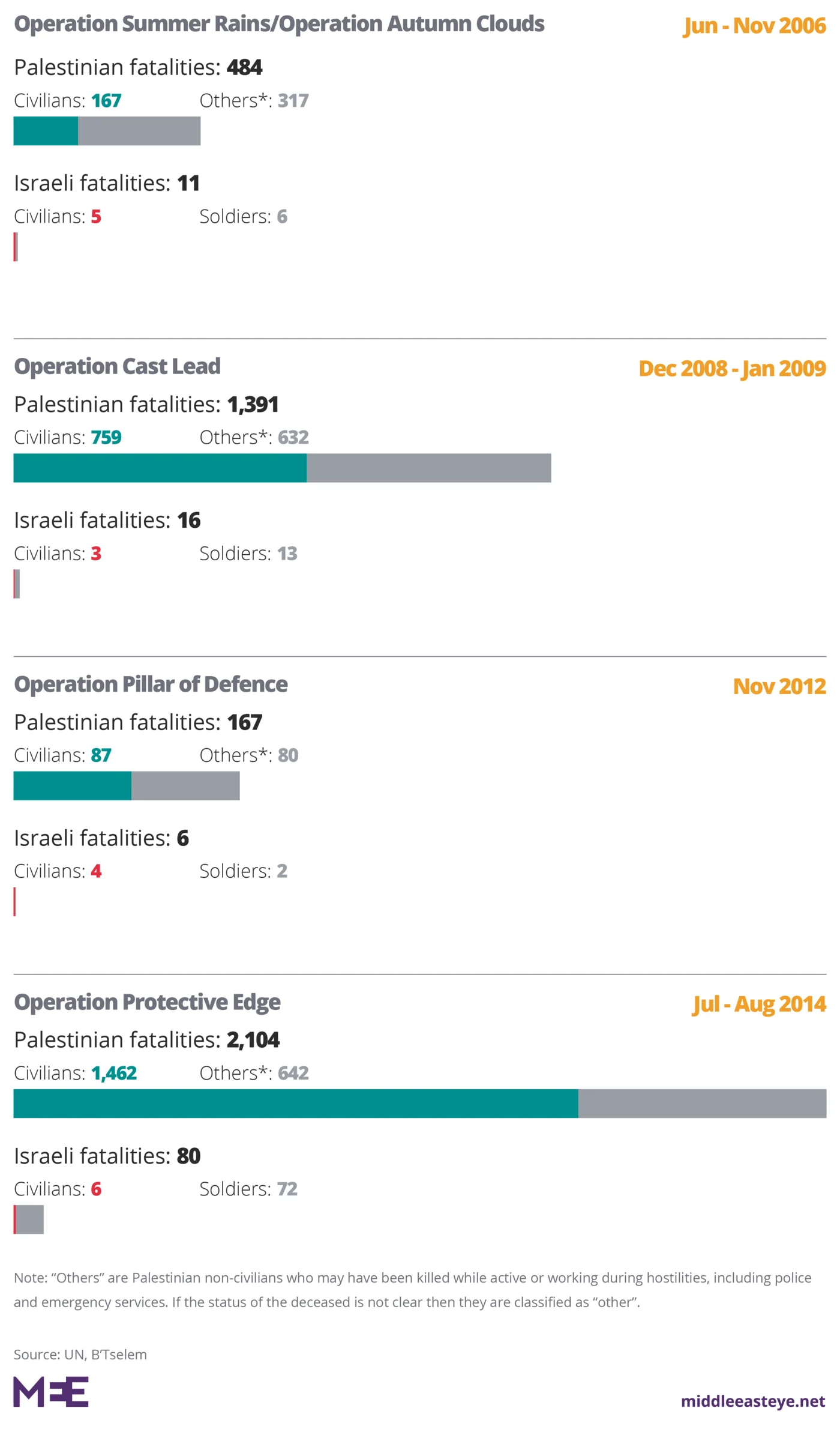 The Israeli army mounted four major operations against Gaza between 2006 and 2014, often, it said, to stop Hamas and other groups firing rockets into Israel. Aside from wrecking infrastructure including electricity lines and power stations, health services and water supplies, military assaults on Gaza have resulted in the deaths of thousands of Palestinians, as well as Israeli soldiers and civilians.
