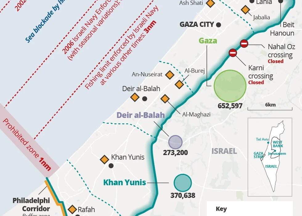 Gaza is bordered to the south by Egypt, to the north and east by Israel and to the west by the Mediterranean sea