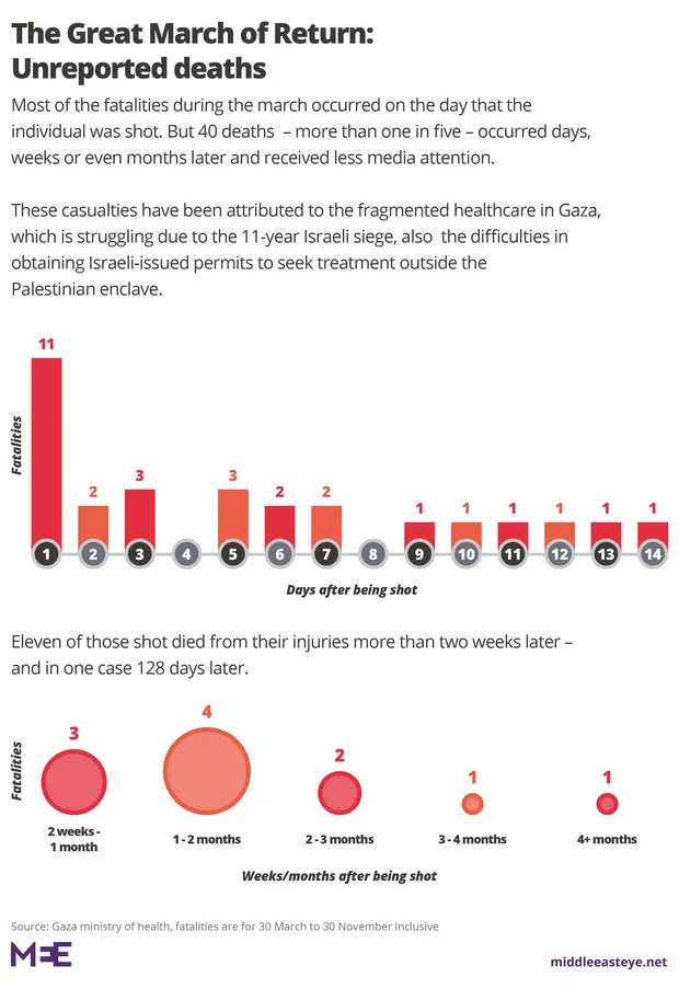 But such high-scale mobilisation has come at a high cost: according to Middle East Eye's calculations, 190 Palestinians were killed by Israeli forces within the scope of the demonstrations between 30 March and 30 November - equivalent to one Palestinian killed every 31 hours in eight months.