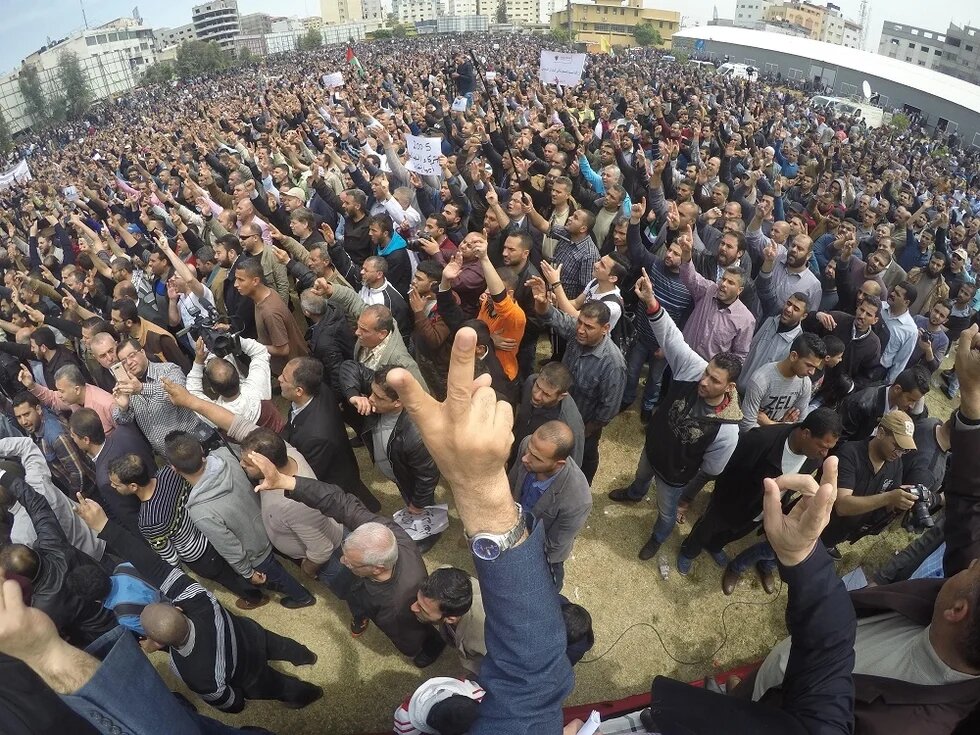 The response in Gaza was an outpouring of anger. Protesters gathered in al-Saraya square in Gaza City last week, calling on the PA's prime minister, Rami Hamdallah, and his finance minister Shukri Bishara to resign: "Leave! Leave, Hamdallah! Don't fight us with the food of our children."